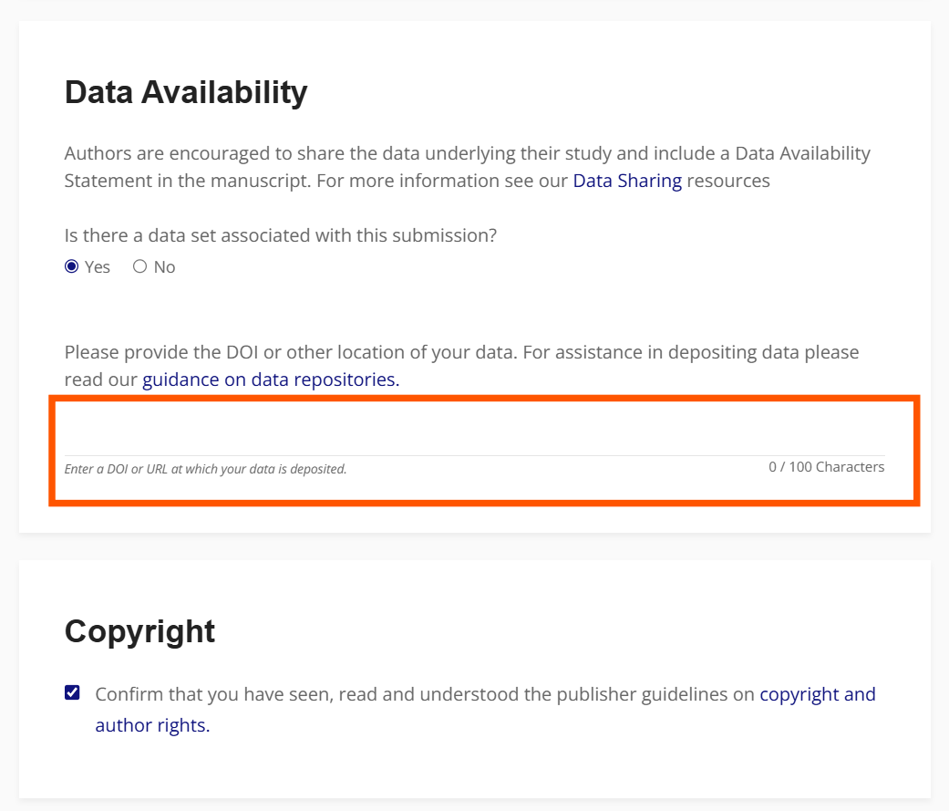 You can then insert the generated link into the editorial system when uploading the manuscript, or include it in the Data Availability Statement with a note that it is a temporary private link that will be replaced by a permanent link (when editing the final manuscript just before publication) after a successful review process.